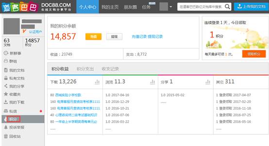 用户下载其他用户上传的文档所支出的积分记录。用户可以查询支出记录“个人中心—积分—收支记录—支出记录”。具体步骤如下:
