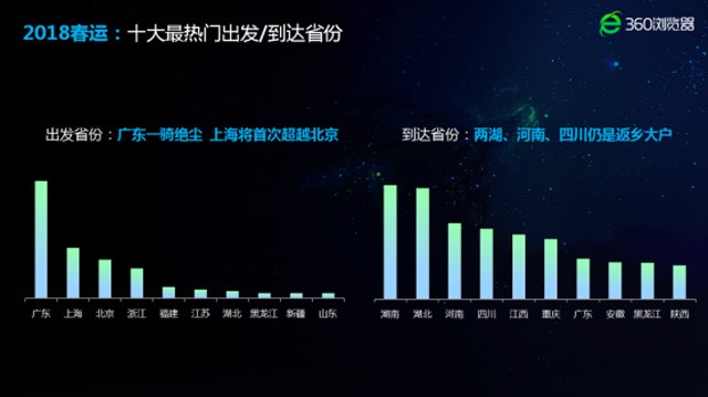 据 360浏览器发布的《2018春运预测报告》,预计“2018年春运期间,广东、北京、上海、浙江等地市出发的车票最为难抢,其次是福建、江苏等地,其中,最拥堵路线将仍被广东、浙江、上海等东南沿海省市包揽。”地域上,整体呈现“北松南紧”的趋势。