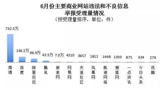 在全国主要网站受理的举报中,微博、百度、阿里巴巴、腾讯、新浪网等主要商业网站受理量占81.9%,达1027.6万件。