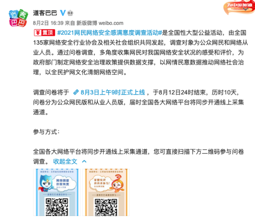 在公司党支部的指导下,内容运营部门充分利用微博、头条等公众平台,转发活动公告,引导更多网民关注本次调查活动。8月3日北京网络安全协会官方网站发布问卷链接后,公司紧跟调查活动开展进度,通过发布问卷二维码链接,助力采集更多有效问卷。3日至12日调查活动开展期间,在公司党支部的统筹领导下,公司各部门加强协作配合,充分发挥互联网平台信息传播优势,及时更新调研活动信息,鼓励用户参与到调查活动中。在公司内部,党支部通过组织开展员工问卷填写活动,助力公司进一步明确网络安全的内容与要求,并安排相应的业务培训,强化员工网络安全意识,加强对用户权益的保护,全面提升公司整体网络安全管理及业务水平。