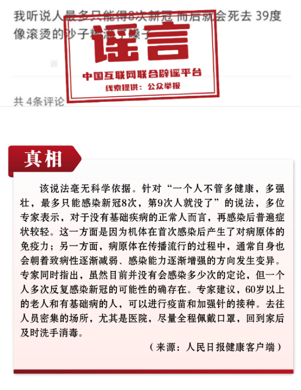 传“伪科普”贩卖焦虑引恐慌。5月以来,全国多地入夏,迎来炎热高温天气,与季节关联性较强的科普信息备受关注,“空调反复开关能省电”“夏天吃‘苦’胜似进补”等误区信息也随之被炒作、散布。特别是近来新冠“二阳”病例增多,“新冠抗体半年保护期”“新冠病毒新型变异株”等信息在网上引发热议,给民众心里平添“忐忑”。于是,有人借机搭蹭热点,以“科普”之名捏造“一个人不管多健康,多强壮,最多只能感染新冠8次,第9次人就没了……”等耸人听闻的谣言,尽管有专家驳斥其“纯属无稽之谈,毫无科学依据”,但仍在一定程度上激发了部分人群的恐慌情绪。