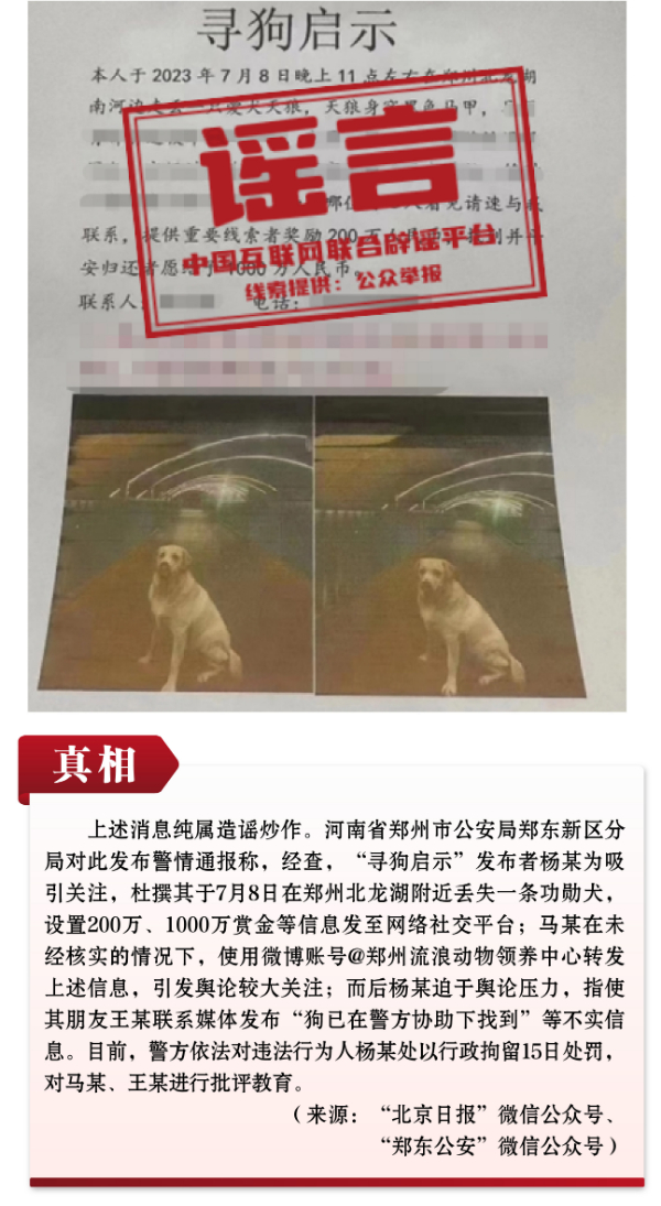 谣言9:郑州有人悬赏1000万寻找丢失爱犬?